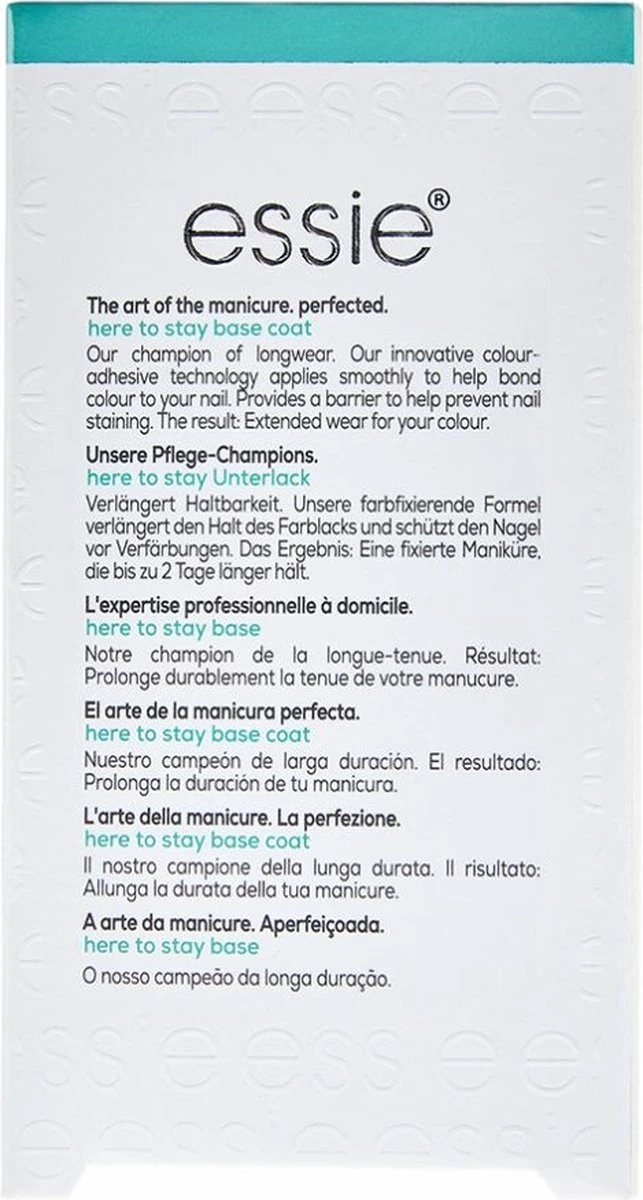 De base coat van essie met kleurhechtingstechnologie is ‘here to stay’! here to stay base coat verminderd het afbladderen van nagellak en zorgt ervoor dat de nagellak tot twee dagen langer blijft zitten. Hierdoor wordt de kwaliteit van de @home manicure verlengt. De base coat is aan te brengen met één simpele applicatie.