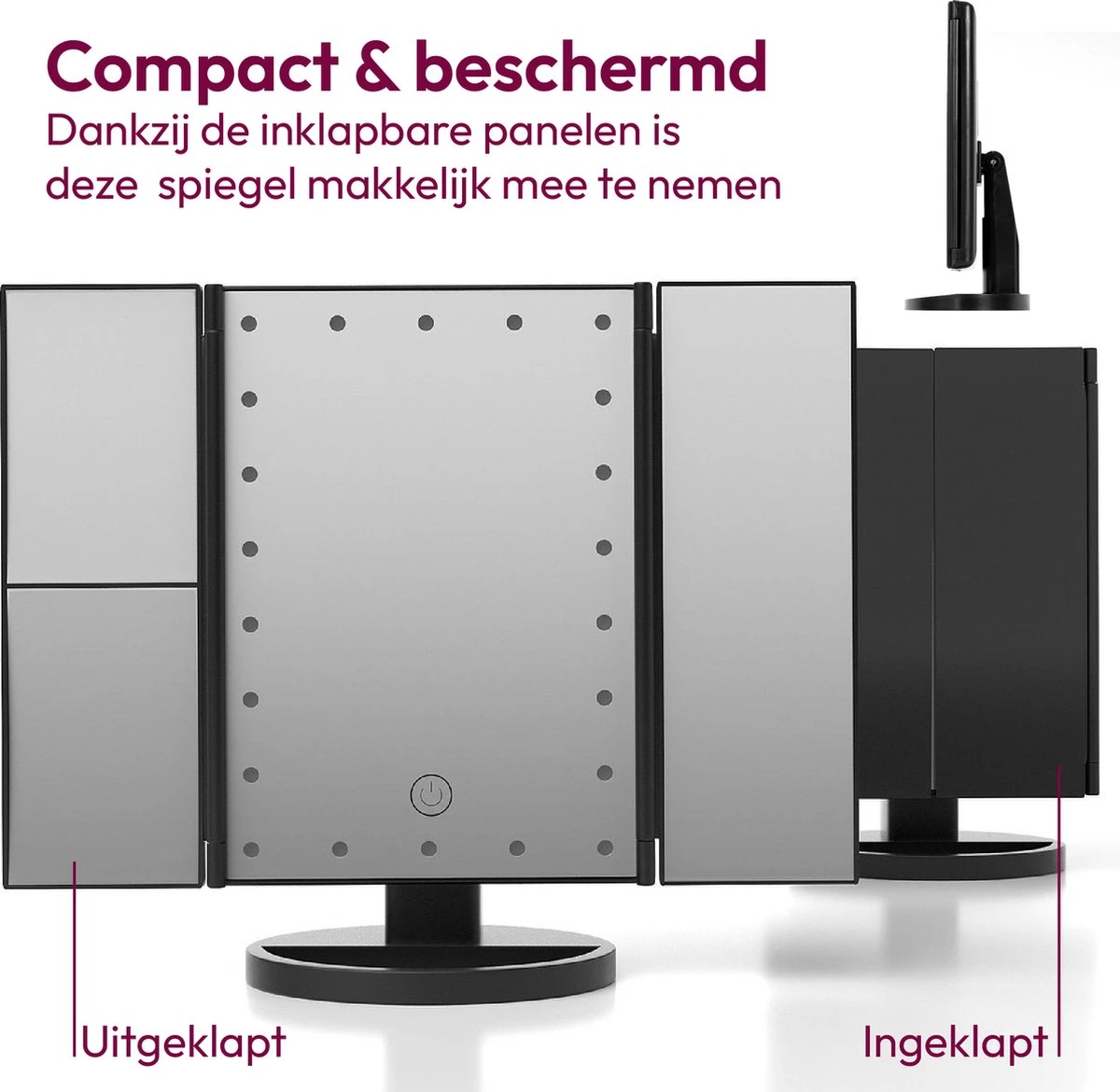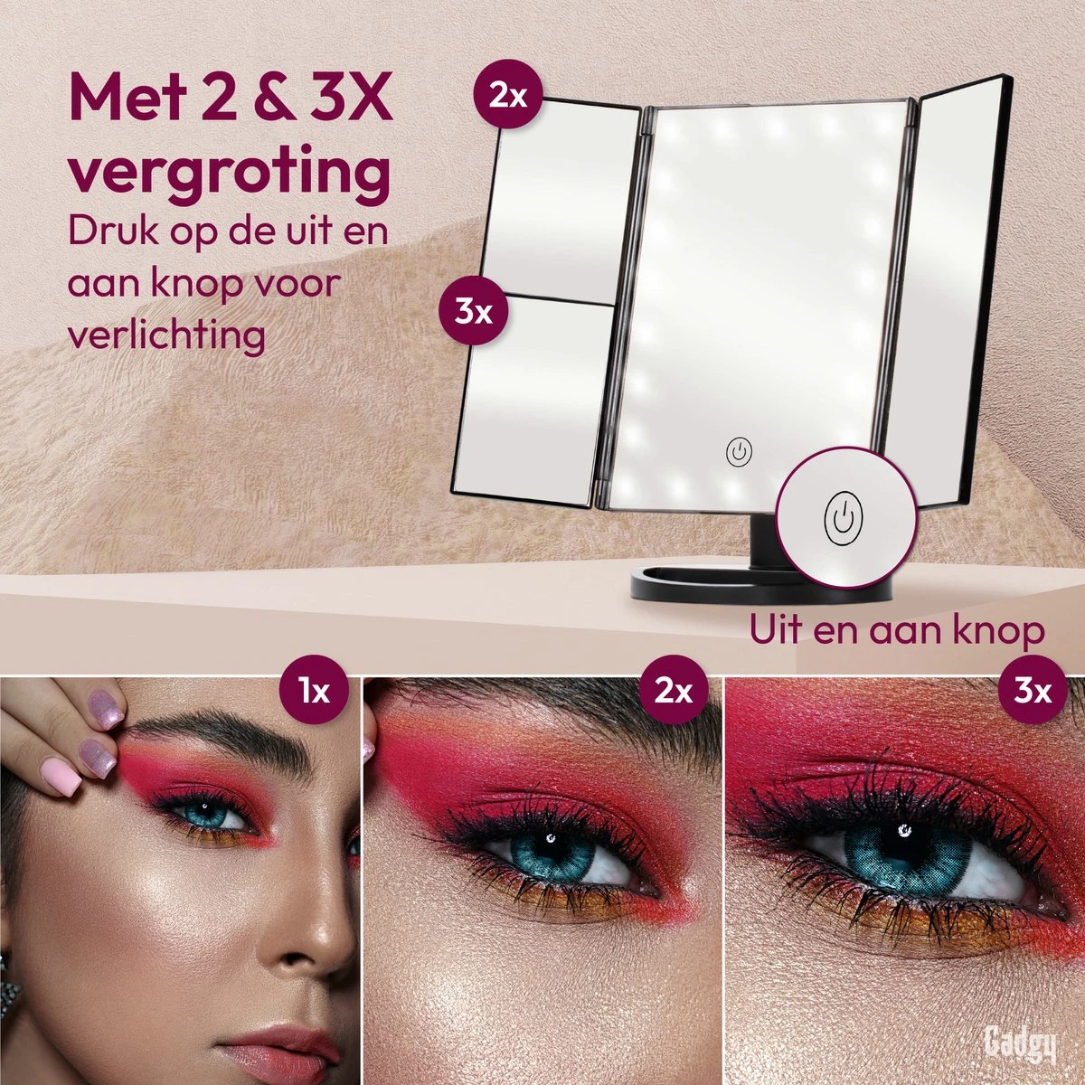 Met de Gadgy Make Up Spiegel met verlichting zit je make-up voortaan altijd goed. Deze spiegel bevat dimbare ledverlichting, waardoor je gezicht altijd perfect belicht is en je nooit meer een detail mist. Door het drieluik ontwerp is de spiegel inklapbaar en gemakkelijk mee te nemen. De verlichting werkt ook op batterijen, waardoor je de spiegel overal kunt neerzetten.