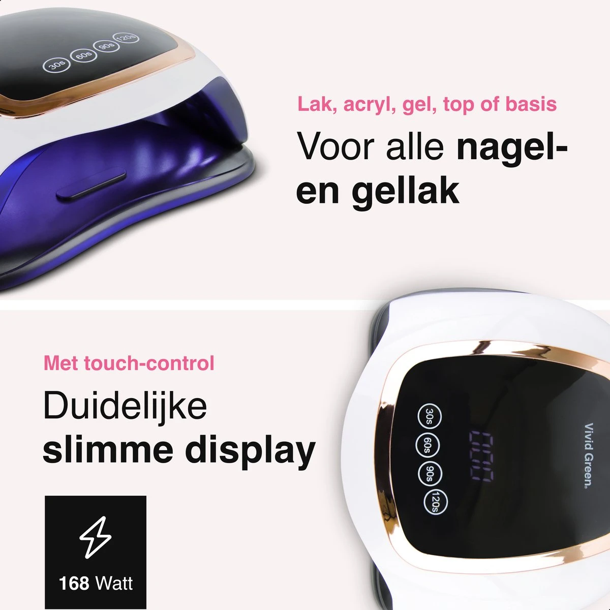 Onze Vivid Green Nageldroger zorgt ervoor dat je nagels binnen no-time droog zijn en je weer stralend de deur uit kan! De gellak lamp bevat vier timers, een low heat functie en intelligente handherkenning om je nagels optimaal te drogen en harden. De nagellamp is voorzien van 42 krachtige UV-ledlampen van 168W die de droogtijd verlagen!